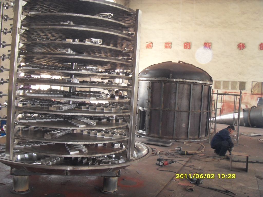 濕物料自加料器連續(xù)地加到干燥器上部干燥盤上,帶有耙葉的耙臂作回轉(zhuǎn)運動使耙臂作回轉(zhuǎn)運動使耙葉連續(xù)地翻抄物料。物料沿指數(shù)螺旋線流過干燥盤表面,在小干燥盤上的物料被移送到外緣,并在外緣落到下方的大干燥盤外緣,在大干盤上物料向里移動并從中間落料口落如下一層小干燥盤中。大小干燥盤上下交替排列,物料得以連續(xù)地流過整個干燥器。中空的干燥盤內(nèi)通入加熱介質(zhì),加熱介質(zhì)形式有飽和蒸汽、熱水和導(dǎo)熱油,加熱介質(zhì)由干燥盤的一端進(jìn)入,從另一端導(dǎo)出。已干物料從后一層干燥盤落到殼體的底層,后被耙葉移送到出料口排出。濕份從物料中逸出,由設(shè)在頂蓋上的排濕口排出,真空型盤式干燥器的濕氣由設(shè)在頂蓋上的真空泵口排出。從底層排出的干物料可直接包裝。通過配加翅片加熱器、溶劑回收冷凝器、袋式除塵器、干料返混機(jī)構(gòu)、引風(fēng)機(jī)等輔機(jī),可提高其干燥的生產(chǎn)能力,干燥膏糊狀和熱敏性物 料,可方便地回收溶劑,并能進(jìn)行熱解和反應(yīng)操作。