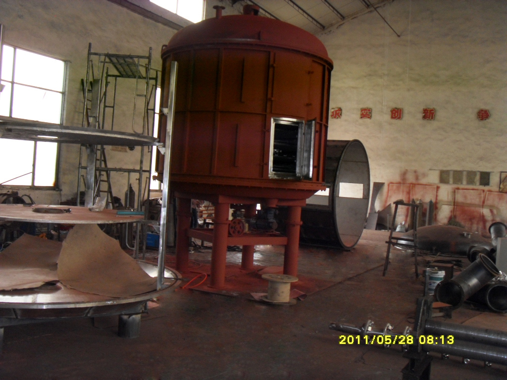 濕物料自加料器連續(xù)地加到干燥器上部干燥盤(pán)上,帶有耙葉的耙臂作回轉(zhuǎn)運(yùn)動(dòng)使耙臂作回轉(zhuǎn)運(yùn)動(dòng)使耙葉連續(xù)地翻抄物料。物料沿指數(shù)螺旋線流過(guò)干燥盤(pán)表面,在小干燥盤(pán)上的物料被移送到外緣,并在外緣落到下方的大干燥盤(pán)外緣,在大干盤(pán)上物料向里移動(dòng)并從中間落料口落如下一層小干燥盤(pán)中。大小干燥盤(pán)上下交替排列,物料得以連續(xù)地流過(guò)整個(gè)干燥器。中空的干燥盤(pán)內(nèi)通入加熱介質(zhì),加熱介質(zhì)形式有飽和蒸汽、熱水和導(dǎo)熱油,加熱介質(zhì)由干燥盤(pán)的一端進(jìn)入,從另一端導(dǎo)出。已干物料從后一層干燥盤(pán)落到殼體的底層,后被耙葉移送到出料口排出。濕份從物料中逸出,由設(shè)在頂蓋上的排濕口排出,真空型盤(pán)式干燥器的濕氣由設(shè)在頂蓋上的真空泵口排出。從底層排出的干物料可直接包裝。通過(guò)配加翅片加熱器、溶劑回收冷凝器、袋式除塵器、干料返混機(jī)構(gòu)、引風(fēng)機(jī)等輔機(jī),可提高其干燥的生產(chǎn)能力,干燥膏糊狀和熱敏性物 料,可方便地回收溶劑,并能進(jìn)行熱解和反應(yīng)操作。