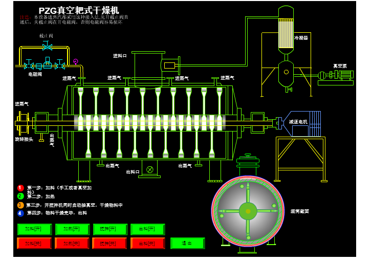 真空耙式干燥機(jī)操作簡(jiǎn)單,進(jìn)出物料方便,大幅度減輕了工人勞動(dòng)強(qiáng)度,同時(shí)也減少了物料在干燥過程中受到的環(huán)境污染,提高了產(chǎn)品質(zhì)量,符合藥品管理規(guī)范“GMP”的要求。